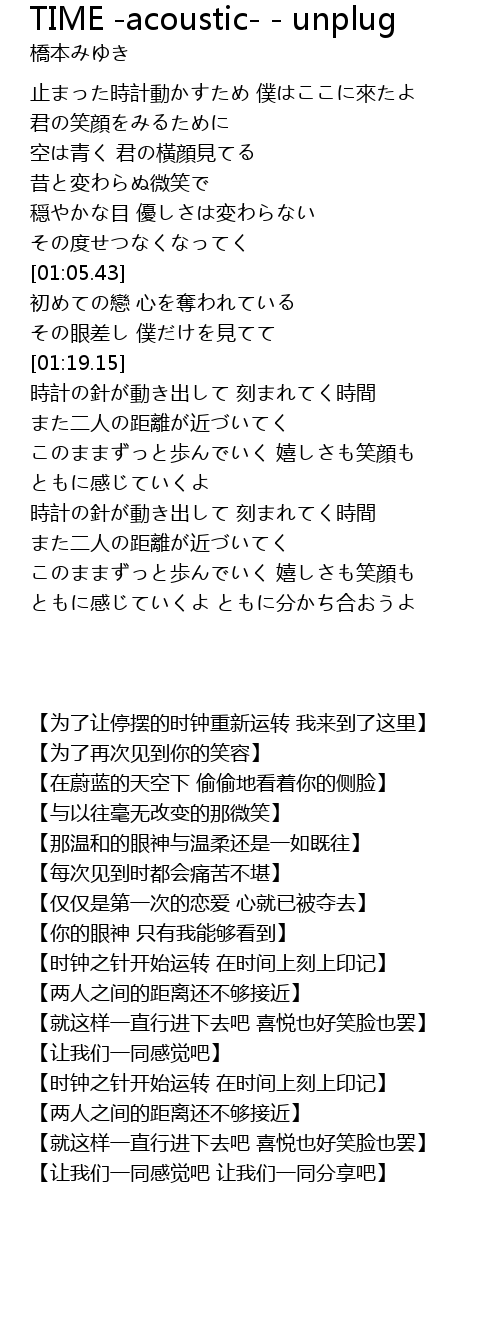 | [01:20.41] | 時計の針が動き出して 刻まれてく時間 |