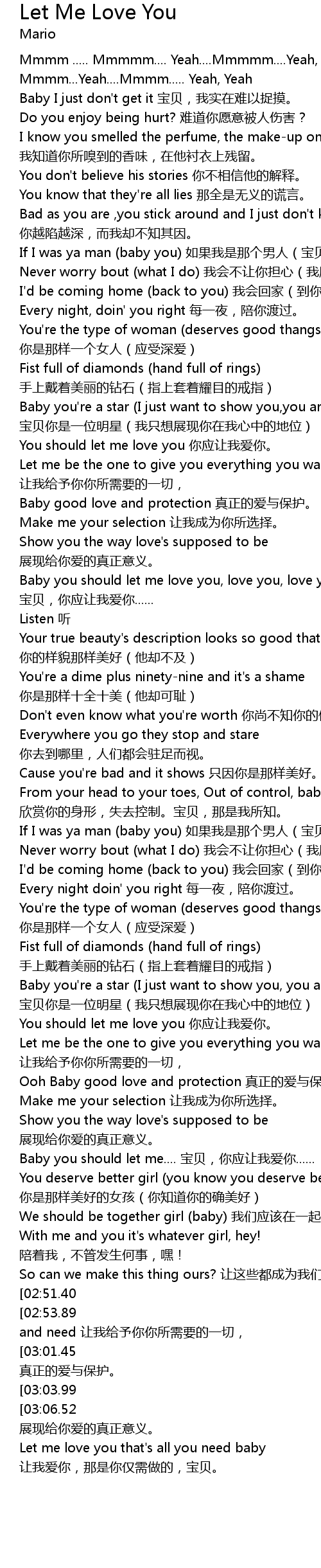 | [03:52.24] | Let me love you that' s all you need baby rang wo ai ni, na shi ni jin xu zuo de, bao bei. |