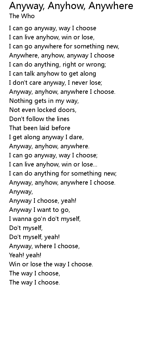Anyway, anyhow, anywhere I choose. |