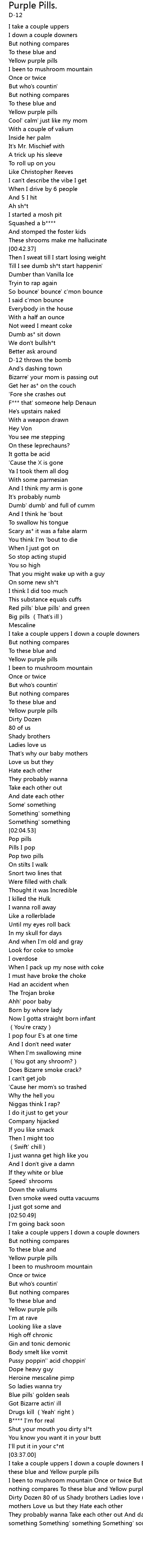 | [03:45.36] | I been to mushroom mountain Once or twice But who's countin' But nothing compares To these blue and Yellow purple pills |
