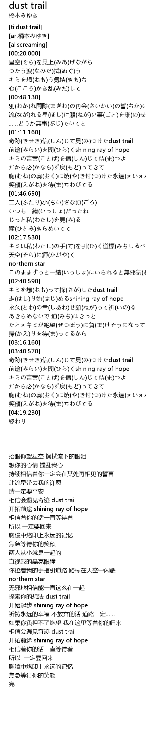 | [03:42.570] | 奇跡(きせき)信(しん)じて見(み)つけたdust trail |