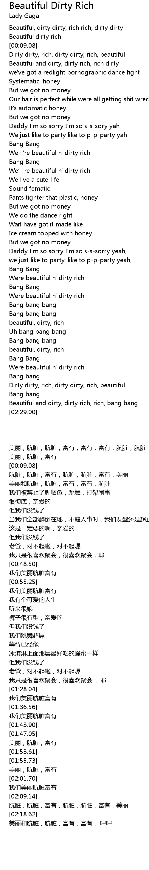 | [00:12.63] | 肮脏,肮脏,富有,肮脏,肮脏,富有,美丽 |