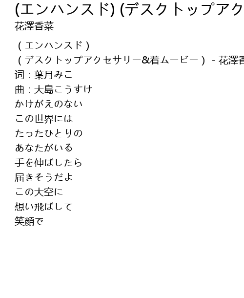 | [00:00.100] | (エンハンスド) (デスクトップアクセサリー&着ムービー) - 花澤香菜 |