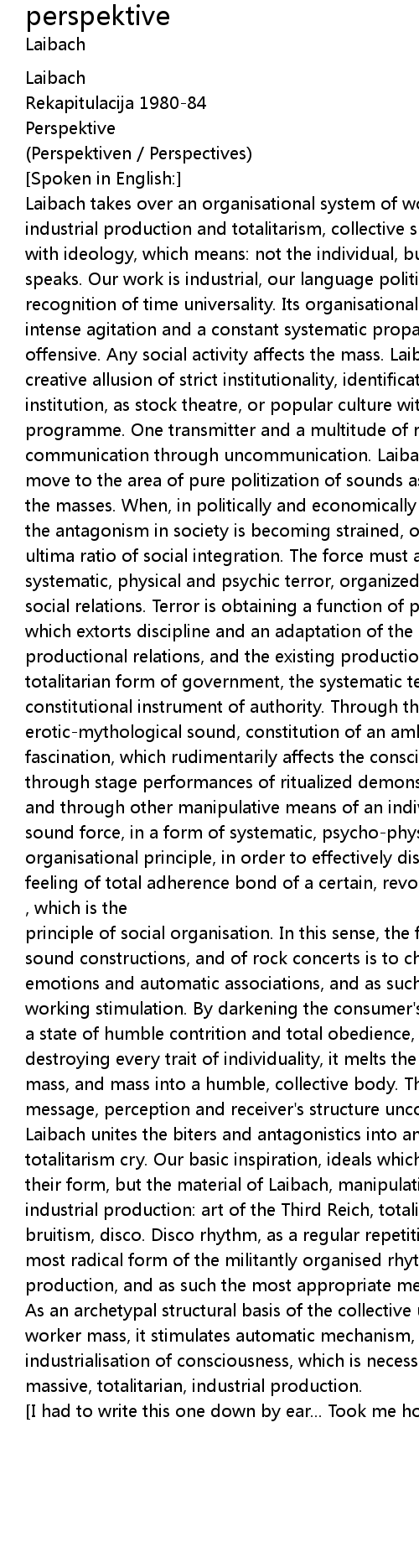 speaks. Our work is industrial, our language political. Laibach is a |