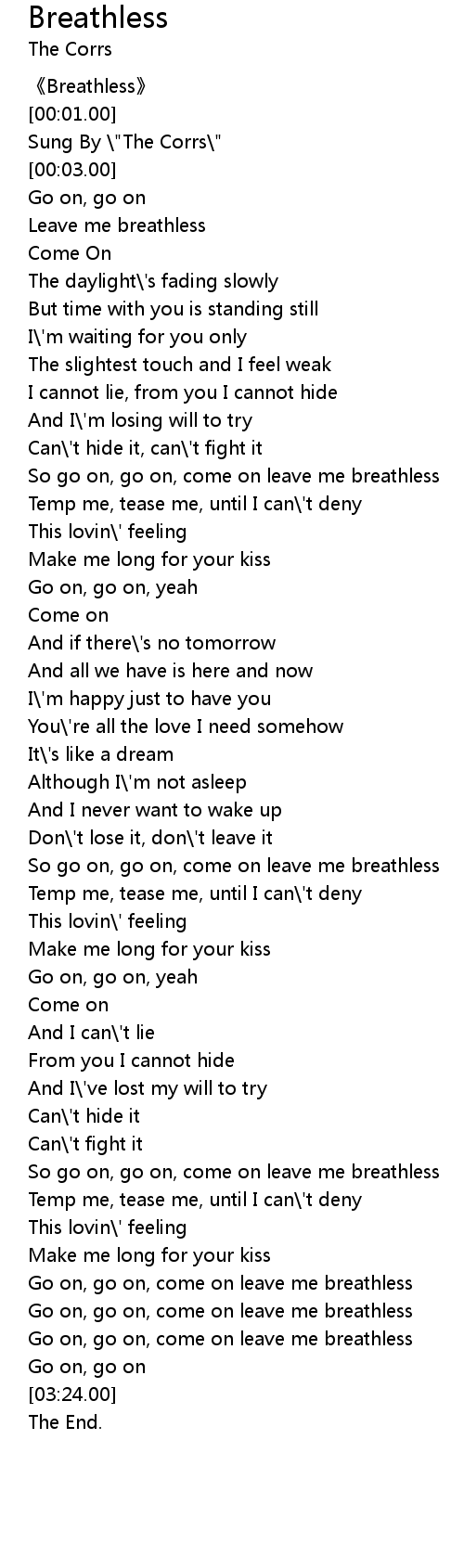 | [03:15.00] | Go on, go on, come on leave me breathless |