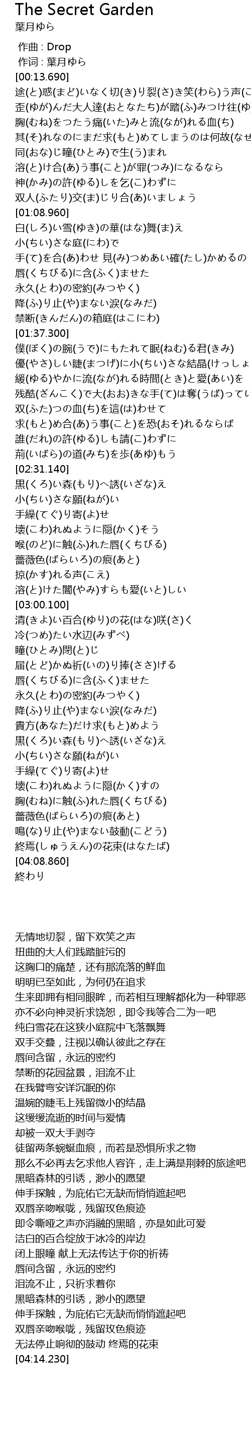 | [01:29.550] | 降(ふ)り止(や)まない涙(なみだ) 禁断(きんだん)の箱庭(はこにわ) |