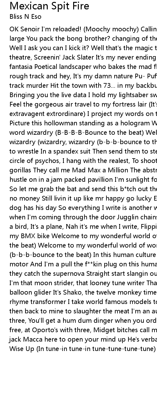 OK Senoir I'm reloaded! (Moochy moochy) Calling all guards to catch the chaps at large You pack the bong brother? changing of the Avon Guard You Cats on charge? Well I ask you can I kick it? Well that's the magic ticket I'm the usher in the theatre, Screenin' Jack Slater It's my never ending story that creates my fantasia Poetical landscaper who bakes the mad flavours Puff the magic on my rough track and hey, It's my damn nature Pu- Puffin the herb Ohhhh Lord this is track murder Hit the town with 73... in my backburner Bliss the broadcaster - Bringing you the live data I hold my lightsaber swinging through the skyscrapers Feel the gorgeous air travel to my fortress lair (It's the invisible, extravagent extrordinare) I project my words on the canvas of the promised land Picture this hollowman standing as a hologram Welcome to my wonderful world of word wizardry (B-B-B-B-Bounce to the beat) Welcome to my wonderful world of word wizardry (wizardry, wizardry (b-b-b-bounce to the beat) Yo! I teach monkeys how to wrestle In a spandex suit Then send them to steal Roger Ramjets boots A circle of psychos, I hang with the realest, To shoot sh*t with a gang of gorillas They call me Mad Max a Million The abstract chamelion Who gets his hustle on in a jam packed pavillion I'm sunlight for those, who live in the dark So let me grab the bat and send this b*tch out the park Yeah I'm the mack with no money Still livin it up like mr happy go lucky Every kid wants to fly Every dog has his day So everything I write is another wall that I break Duck down, when I'm coming through the door Jugglin chainsaws and running from the law It's a bird, It's a plane, Nah it's me when I write, Flippin off you motherf*cka's on my BMX bike Welcome to my wonderful world of word wizardry (B-B-B-B-Bounce to the beat) Welcome to my wonderful world of word wizardry (wizardry, wizardry (b-b-b-bounce to the beat) In this human culture My soul has just diffused my motor And I'm a pull the f**kin plug on this human Choser I'm a keep rappin till they catch the supernova Straight start slangin out the back of my lunar rover I'm that moon strider, that looney tune writer That parachute lagoon diver Air balloon glider It's Shako, the twelve monkey time transporter Audio, NVA the rhyme transformer I take world famous models to an all you can eat Rib House then back to mine to slaughter the meat I'm an audio freak and by a quater to three, You'll get a hum dum dinger when you order from me I made a porno for free, at Oporto's with three, Midget bitches call me audio theif It's lumber jack Macca here to open your mind up He's verbally violent like Oprah's vagina Wise Up (In tune-in tune-in tune-tune-tune-tune)
