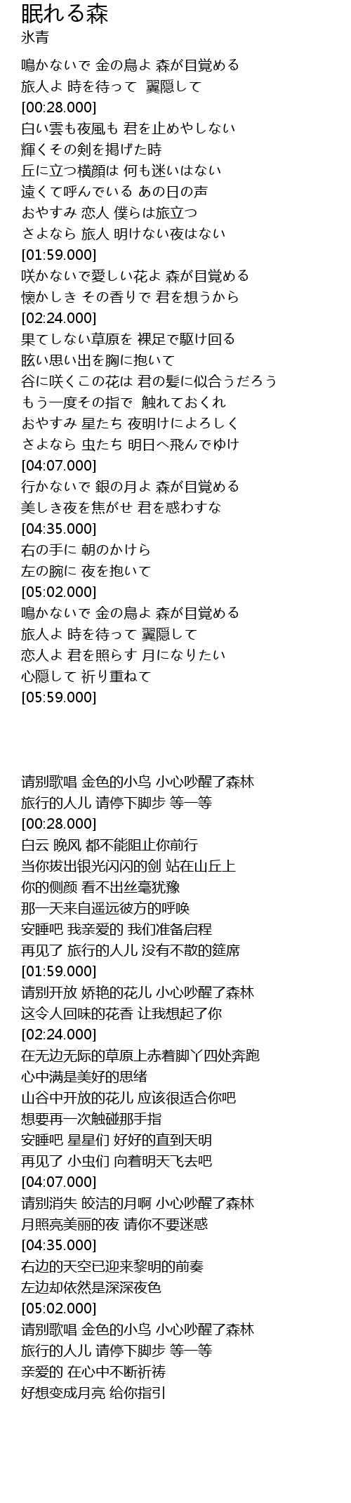 | [00:00.310] | 鳴かないで 金の鳥よ 森が目覚める |