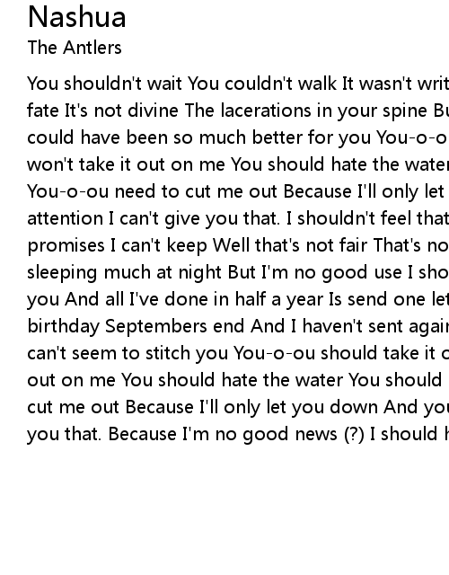 You shouldn't wait You couldn't walk It wasn't written out in chalk It wasn't fate It's not divine The lacerations in your spine But thats no way an excuse I could have been so much better for you You-o-ou should take it out on me But you won't take it out on me You should hate the water You should hate the world You-o-ou need to cut me out Because I'll only let you down And you deserve attention I can't give you that. I shouldn't feel that every week I'm making promises I can't keep Well that's not fair That's not right Cause you're not sleeping much at night But I'm no good use I should have been so much better for you And all I've done in half a year Is send one letter out of here On your birthday Septembers end And I haven't sent again Because it's no use Because I can't seem to stitch you You-o-ou should take it out on me But you won't take it out on me You should hate the water You should hate the world You-o-ou need to cut me out Because I'll only let you down And you deserve attention I can't give you that. Because I'm no good news (?) I should have been so much better for you |