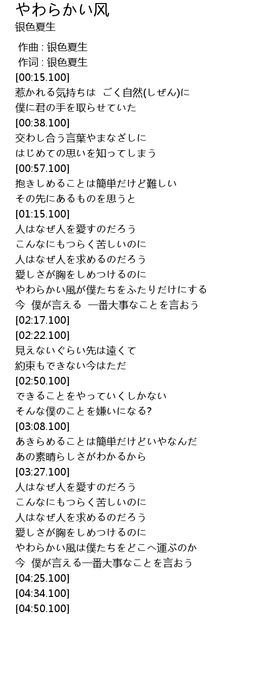 | [04:05.100] | やわらかい風は僕たちをどこへ運ぶのか |