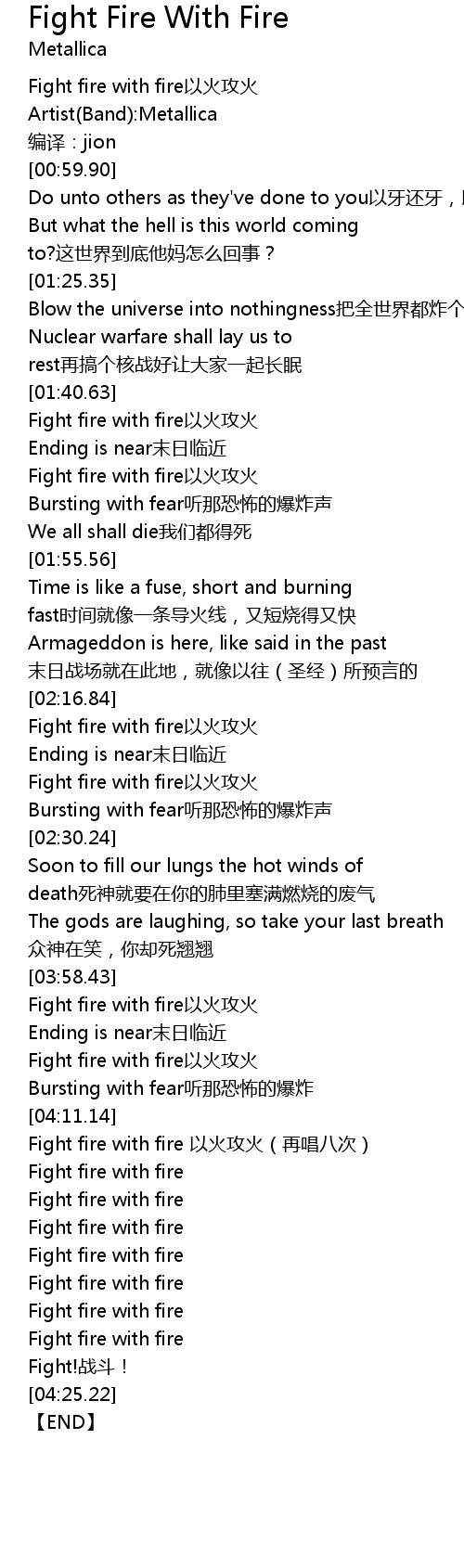 | [04:06.75] | Fight fire with fire yǐ huǒ gōng huǒ |