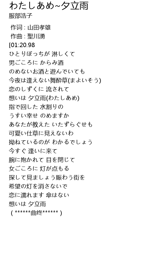 | [01:13.96] | 想いは 夕立雨(わたしあめ) |