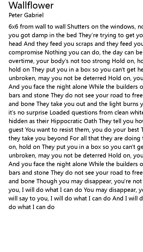 6x6 from wall to wall Shutters on the windows, no light at all Damp on the floor you got damp in the bed They're trying to get you crazy - get you out of your head And they feed you scraps and they feed you lies To lower your defences, no compromise Nothing you can do, the day can be long Your mind is working overtime, your body's not too strong Hold on, hold on Hold on, hold on Hold on, hold on They put you in a box so you can't get heard Let your spirit stay unbroken, may you not be deterred Hold on, you have gambled with your own life And you face the night alone While the builders of the cages Sleep with bullets, bars and stone They do not see your road to freedom That you build with flesh and bone They take you out and the light burns your eyes To the talking room - it's no surprise Loaded questions from clean white coats Their eyes are all as hidden as their Hippocratic Oath They tell you how to behave, behave as their guest You want to resist them, you do your best They take you to your limits, they take you beyond For all that they are doing there's no way to respond Hold on, hold on They put you in a box so you can't get heard Let your spirit stay unbroken, may you not be deterred Hold on, you have gambled with your own life And you face the night alone While the builders of the cages Sleep with bullets, bars and stone They do not see your road to freedom That you build with flesh and bone Though you may disappear, you're not forgotten here And I will say to you, I will do what I can do You may disappear, you're not forgotten here And I will say to you, I will do what I can do And I will do what I can do And I will do what I can do |