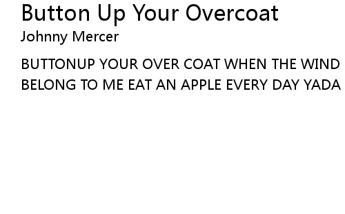 BUTTONUP YOUR OVER COAT WHEN THE WIND IS FREE TAKE GOOD CARE OF YOUR SELFYOU BELONG TO ME EAT AN APPLE EVERY DAY YADA YAD YADA YAD ................