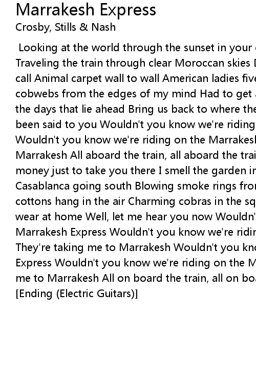 [Intro. (Electric Guitars)] Looking at the world through the sunset in your eyes Traveling the train through clear Moroccan skies Ducks and pigs and chickens call Animal carpet wall to wall American ladies five-foot tall in blue Sweeping cobwebs from the edges of my mind Had to get away to see what we could find Hope the days that lie ahead Bring us back to where they've led Listen not to what's been said to you Wouldn't you know we're riding on the Marrakesh Express Wouldn't you know we're riding on the Marrakesh Express They're taking me to Marrakesh All aboard the train, all aboard the train I've been saving all my money just to take you there I smell the garden in your hair Take the train from Casablanca going south Blowing smoke rings from the corners of my mouth Colored cottons hang in the air Charming cobras in the square Striped djellebas we can wear at home Well, let me hear you now Wouldn't you know we're riding on the Marrakesh Express Wouldn't you know we're riding on the Marrakesh Express They're taking me to Marrakesh Wouldn't you know we're riding on the Marrakesh Express Wouldn't you know we're riding on the Marrakesh Express They're taking me to Marrakesh All on board the train, all on board the train All on board [Ending (Electric Guitars)] |