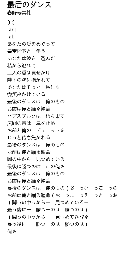 | [02:50.71] | 最後のダンスは 俺のもの(さーっいーっごーっのーっダーッンーッスーッはー) |