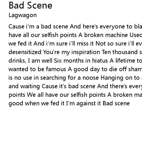 Cause i'm a bad scene And here's everyone to blame but me Everyone points We all have all our selfish points A broken machine Used to puke up something good when we fed it And i'm sure i'll miss it Not so sure i'll ever see you Five years desensitized You're my inspiration Ten thousand silent miles to hell Four well drinks, I am well Six months in hiatus A lifetime too short to save us Never wanted to be famous A good day to die off shameless So fuck longevity When there is no use in searching for a noose Hanging on to abuse Sick of hanging around and waiting Cause it's bad scene And there's everyone to blame but me Everyone points We all have our selfish points A broken machine Used to puke up someting good when we fed it I'm against it Bad scene |
