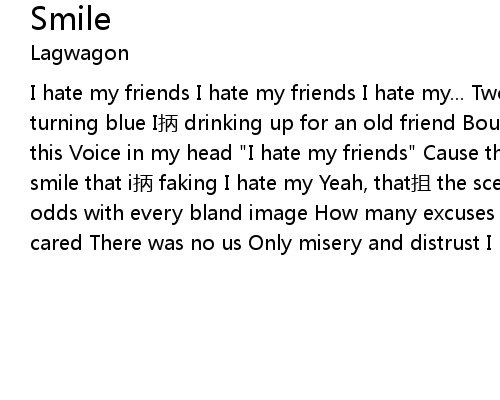 | I hate my friends I hate my friends I hate my... Two in the morning here I am turning blue I bǐng drinking up for an old friend Bourbon can yāng clean my mind of this Voice in my head " I hate my friends" Cause they make me Think about the smile that i bǐng faking I hate my Yeah, that zhā the scene that I am in Lying At odds with every bland image How many excuses can this Fool listen to You never cared There was no us Only misery and distrust I hate my... |