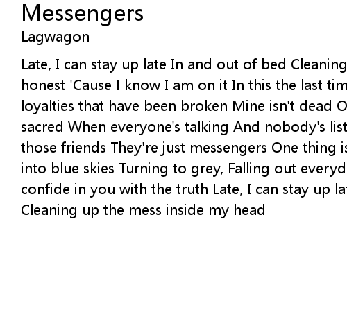 Late, I can stay up late In and out of bed Cleaning up the mess Trying to be honest 'Cause I know I am on it In this the last time I speak of it The loyalties that have been broken Mine isn't dead One thing is true Nothing is sacred When everyone's talking And nobody's listening When we confide in all those friends They're just messengers One thing is true You throw the matters into blue skies Turning to grey, Falling out everyday One thing that's free I confide in you with the truth Late, I can stay up late In and out of bed Cleaning up the mess inside my head |