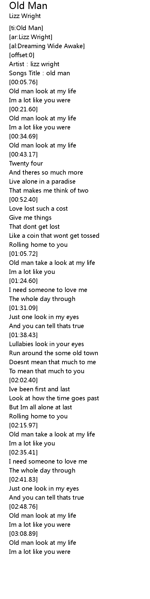 | [00:15.14] | Old man look at my life |