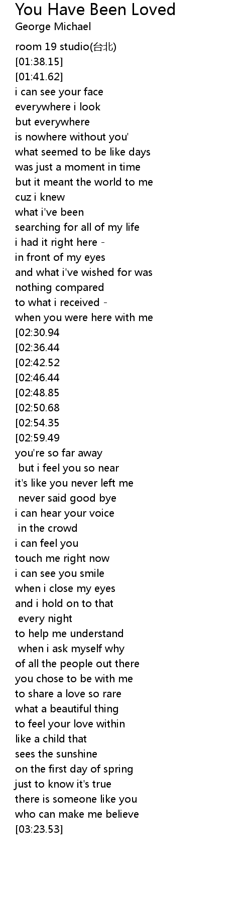 | [03:58.80][02:59.49][01:32.56] | to be loved |