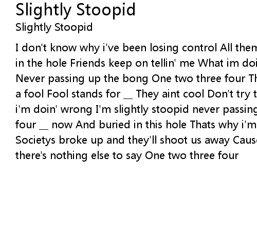 I don't know why i've been losing control All them fuck all this shit And down in the hole Friends keep on tellin' me What im doin wrong I'm slightly stoopid Never passing up the bong One two three four They try and say to me that im such a fool Fool stands for __ They aint cool Don't try to say to me what the hell i'm doin' wrong I'm slightly stoopid never passing up that bong One two three four __ now And buried in this hole Thats why i'm so stoopid and out of control Societys broke up and they'll shoot us away Cause i'm slighty stoopid And there's nothing else to say One two three four