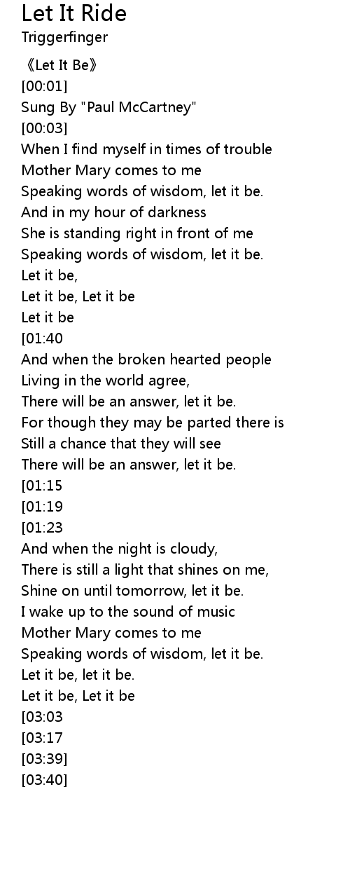| [02:26][01:40][00:40] | Whisper words of wisdom, let it be. |