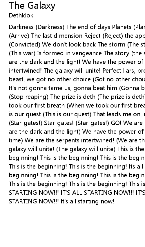 Darkness (Darkness) The end of days Planets (Planets) Kinetic haze Arrive (Arrive) The last dimension Reject (Reject) the apprehension Convicted (Convicted) We don't look back The storm (The storm) Electric black This war (This war) Is formed in vengeance The story (the story) Has been predicted We are the dark and the light! We have the power of time! We are the serpents intertwined! The galaxy will unite! Perfect liars, promising us Can't stop the beast, we got no other choice (Got no other choice) Unforgiving soulless nature It's not gonna tame us, gonna beat him (Gonna beat him) Not gonna stop reaping (Stop reaping) The prize is deth (The prize is deth) We made the pact when we took our first breath (When we took our first breath) Fearless (Fearless) This is our quest (This is our quest) That leads me on, man the star-gates! (Star-gates!) Star-gates! (Star-gates!) GO! We are the dark and the light! (We are the dark and the light) We have the power of time! (We have the power of time) We are the serpents intertwined! (We are the serpents intertwined) The galaxy will unite! (The galaxy will unite) This is the beginning! This is the beginning! This is the beginning! This is the beginning! This is the beginning! This is the beginning! This is the beginning! Its all starting NOW! This is the beginning! This is the beginning! This is the beginning! This is the beginning! This is the beginning! This is the beginning! This is the beginning! IT'S ALL STARTING NOW!!! IT'S ALL STARTING NOW!!! IT'S ALL STARTING NOW!!! IT'S ALL STARTING NOW!!! It's all starting now! |