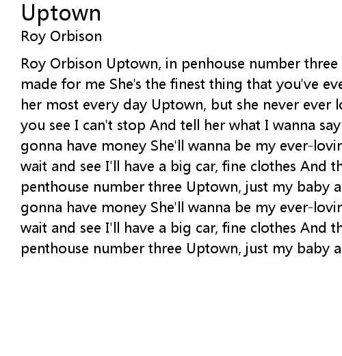 Roy Orbison Uptown, in penhouse number three Uptown, there lives a doll just made for me She's the finest thing that you've ever seen, oh ho ha Uptown, I see her most every day Uptown, but she never ever looks my way I'm just a bellhop, you see I can't stop And tell her what I wanna say That one of these days, I'm gonna have money She'll wanna be my ever-lovin' honey It won't be long, just wait and see I'll have a big car, fine clothes And then I'll be Uptown, in penthouse number three Uptown, just my baby and me Yeah, one of these days, I'm gonna have money She'll wanna be my ever-lovin' honey It won't be long, just wait and see I'll have a big car, fine clothes And then I'll be Uptown, in penthouse number three Uptown, just my baby and me |