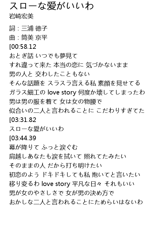 | [01:35.58][03:31.82] | スローな愛がいいわ だから スローな愛がいいわ |
