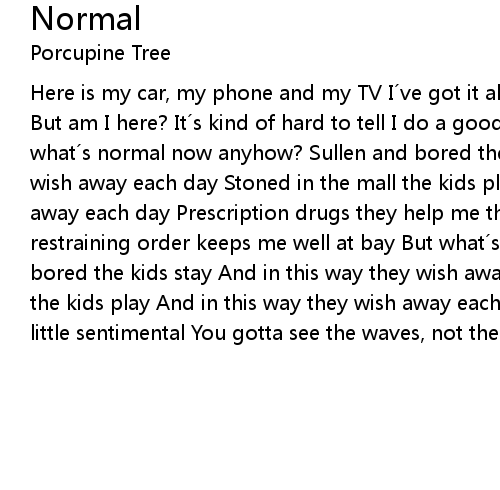 | Here is my car, my phone and my TV I ve got it all but you can see through me But am I here? It s kind of hard to tell I do a good impression of myself But what s normal now anyhow? Sullen and bored the kids stay And in this way they wish away each day Stoned in the mall the kids play And in this way they wish away each day Prescription drugs they help me through the day And that restraining order keeps me well at bay But what s normal now anyway? Sullen and bored the kids stay And in this way they wish away each day Stoned in the mall the kids play And in this way they wish away each day Wish I was old and a little sentimental You gotta see the waves, not the wine bottle |