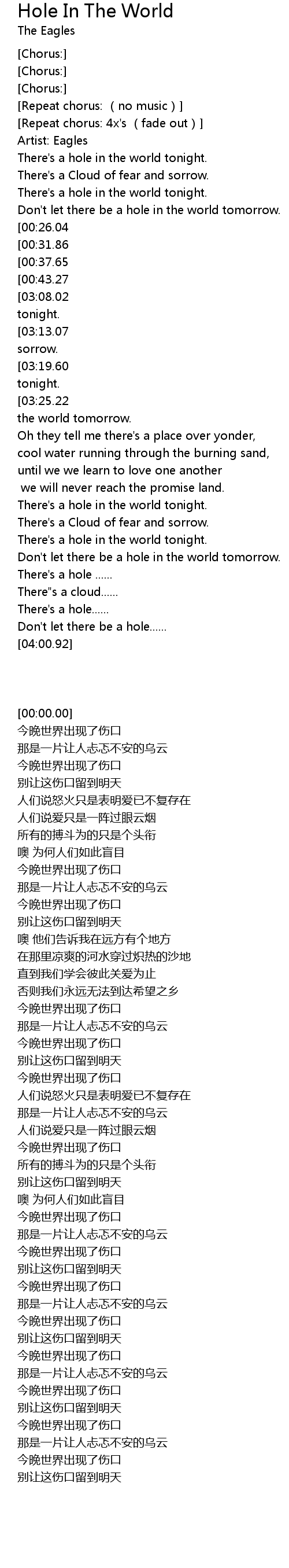 | [03:42.85][03:19.60][02:56.25][02:32.66][00:59.10] | There' s a hole in the world tonight. |
