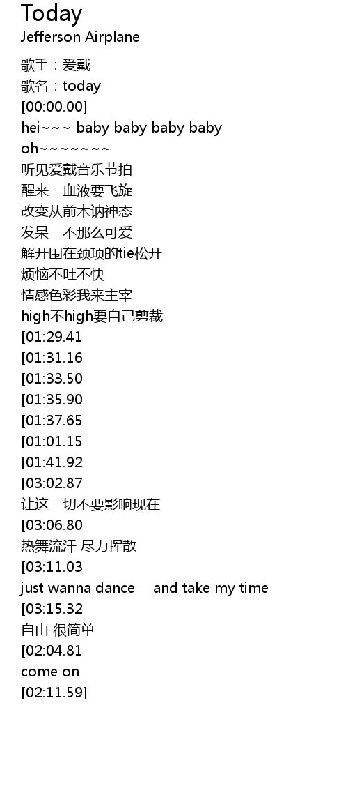 | [03:32.30][03:15.32][02:57.96][01:58.82][01:22.65] | how you feel tonight So 快乐 自由 很简单 |