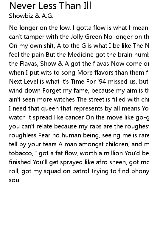 No longer on the low, I gotta flow is what I mean Let the critics know they can't tamper with the Jolly Green No longer on the low because my flows be tight On my own shit, A to the G is what I be like The Neighborhood Sickness makes you feel the pain But the Medicine got the brain numb like novacaine Red hot, Got the Flavas, Show & A got the flavas Now come on with the get down A full blitz when I put wits to song More flavors than them freaky 411s your bitch got on Next Level is what it's Time For '94 missed us, but check us when nine pound wind down Forget my fame, because my aim is the riches Even Robert DeNiro, he ain't seen more witches The street is filled with chickens, some finger-licking I need that queen that represents by all means You're bopping your head, now watch it spread like cancer On the move like go-go, burn you like Jo Jo Dancer, you can't relate because my raps are the roughest Retaliate, but you wrath is roughless Fear no human being, seeing me is rare Time has took its toll, I can tell by your tears A man amongst children, and my records make a killing Like tobacco, I got a fat flow, worth a million You'd better breeze cause you're finished You'll get sprayed like afro sheen, got more green than spinach Time to roll, got my squad on patrol Trying to find phony fellas faking like they got soul |