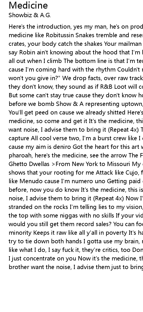 Here's the introduction, yes my man, he's on production Veterans bringing that medicine like Robitussin Snakes tremble and resemble earthquakes Go against the crates, your body catch the shakes Your mailman ain't got what I'm delivering I say Robin ain't knowing about the hood that I'm living in Giving in? Never, I go all out when I climb The bottom line is that I'm terror You'll get scarred, cause I'm coming hard with the rhythm Couldn't maintain, need help, say "God won't you give in?" We drop facts, over raw tracks that's starring me And Show, they don't know, they sound as if R&B Loot will come later if we stay true now But some can't stay true cause they don't know how Peep it, you'll be gone before we bomb Show & A representing uptown, check your math, that's heal on You'll get peed on cause we already shitted Here's the cure for hip-hop, the medicine, so come and get it It's the medicine, this is how we swing it Suckers want noise, I advise them to bring it (Repeat 4x) The second chapter will capture All cool verse two, I'm a burst crew like I capped ya Forget the fame cause my aim is deniro Got the heart for this art with the smarts like Shapiro A pharoah, here's the medicine, see the arrow The Fellas, the Neighbors, and the Ghetto Dwellas >From New York to Missouri My glory is handshakes and hugs that shows that your rooting for me Attack like Cujo, fat like a sumo Pulling mommies like Menudo cause I'm numero uno Getting paid out my coolo So if you didn't know before, now you do know It's the medicine, this is how we swing it Suckers want noise, I advise them to bring it (Repeat 4x) Now I'm bulding with my man, stranded on the rocks I'm telling lies to my vision, peeping out the box Near the top with some niggas with no skills If your videos didn't have them hoes, would you still get them record sales? You can fool the majority, but the minority Keeps it raw like all y'all in poverty It's hard to be the man, they try to tie down both hands I gotta use my brain, maintain and expand Some don't like what I do, I say fuck it, they're critics, too Don't contemplate with them, I just concentrate on you Now it's the medicine, this is how I swing it A brother want the noise, I advise them just to bring it (Repeat 4x) |