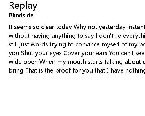 | It seems so clear today Why not yesterday instant replay There I go again without having anything to say I don't lie everything I said to you was true But still just words trying to convince myself of my position on the same level as you Shut your eyes Cover your ears You can't see my eyes Because my mouth is too wide open When my mouth starts talking about everything I have and what I can bring That is the proof for you that I have nothing |