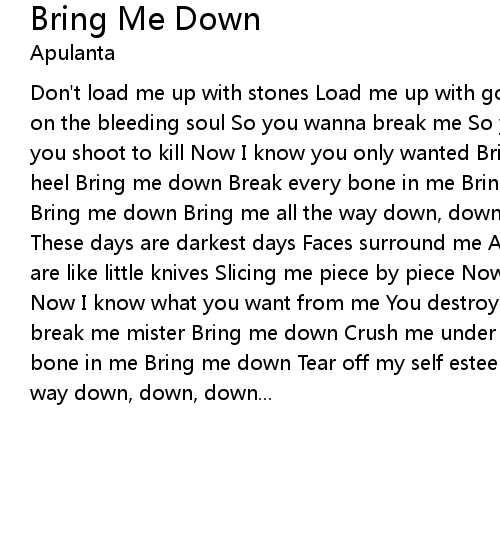 | Don't load me up with stones Load me up with gold Weight on the shoulders Weight on the bleeding soul So you wanna break me So you wanna break my will Now I know you shoot to kill Now I know you only wanted Bring me down Crush me under your heel Bring me down Break every bone in me Bring me down Tear off my self esteem Bring me down Bring me all the way down, down, down... These days are murder These days are darkest days Faces surround me All turning to one big mess Words are like little knives Slicing me piece by piece Now I know you shoot to kill Now I know what you want from me You destroy my solar system, but you'll never break me mister Bring me down Crush me under your heel Bring me down Break every bone in me Bring me down Tear off my self esteem Bring me down Bring me all the way down, down, down... |