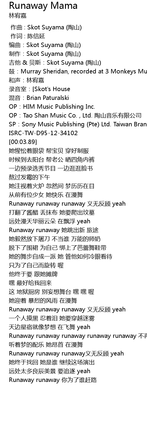 | [03:08.64] | Runaway runaway runaway yi wu fan gu yeah |