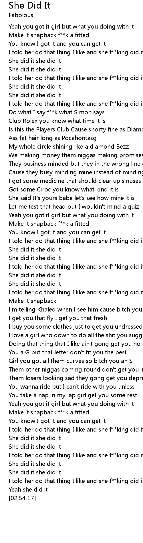 [02:49.46] I told her do that thing I like and she f**king did it