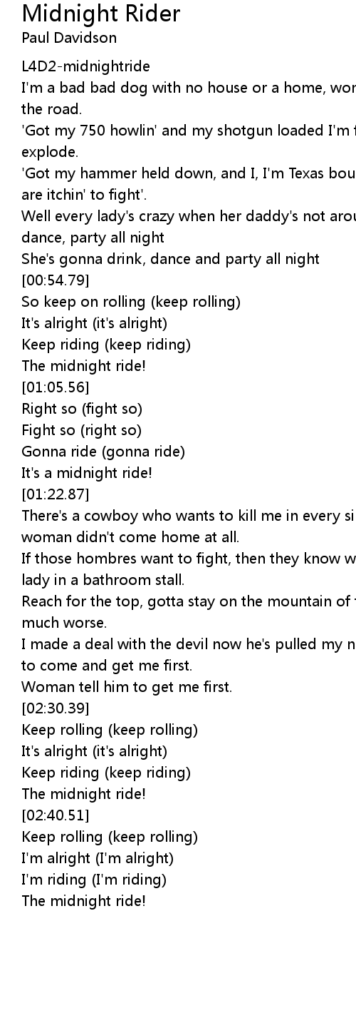 [00:18.99] I'm a bad bad dog with no house or a home, women, whiskey, wheels and the road.
