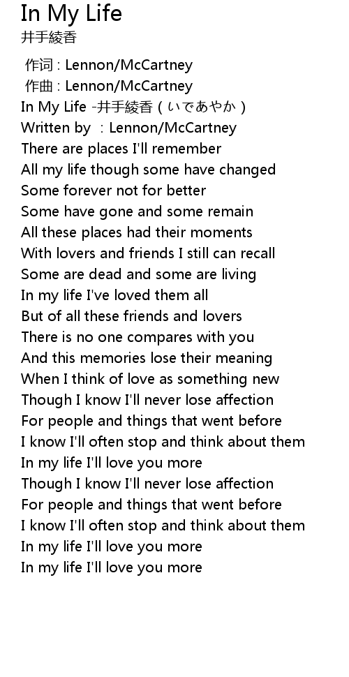 | [00:00.330] | In My Life jǐng shǒu líng xiāng |