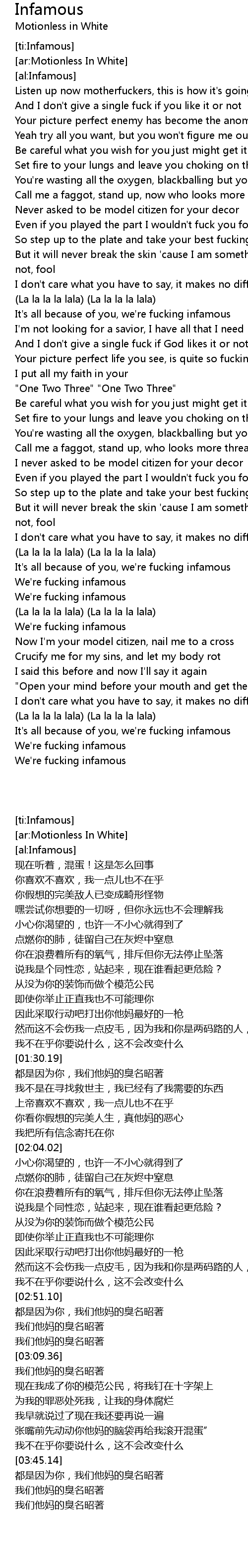 | [01:33.54] | It's all because of you, we're fucking infamous |