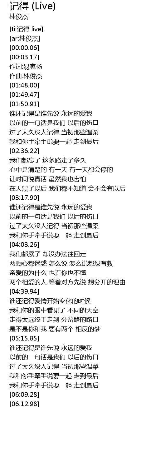 | [03:19.32] | 谁还记得是谁先说 永远的爱我 |