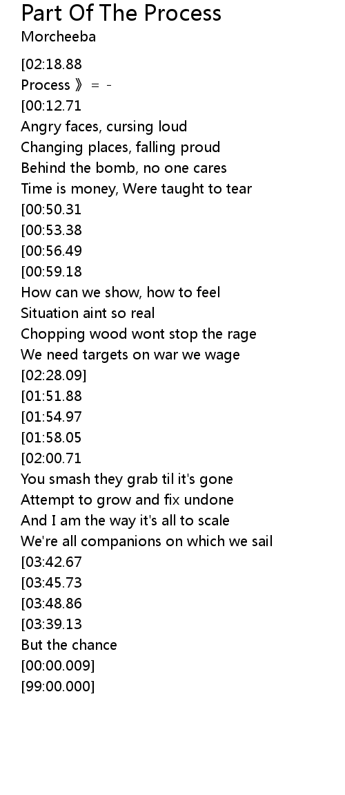 | [04:06.59][02:18.88][01:17.35][00:00.100] | Morcheeba Part Of The Process |