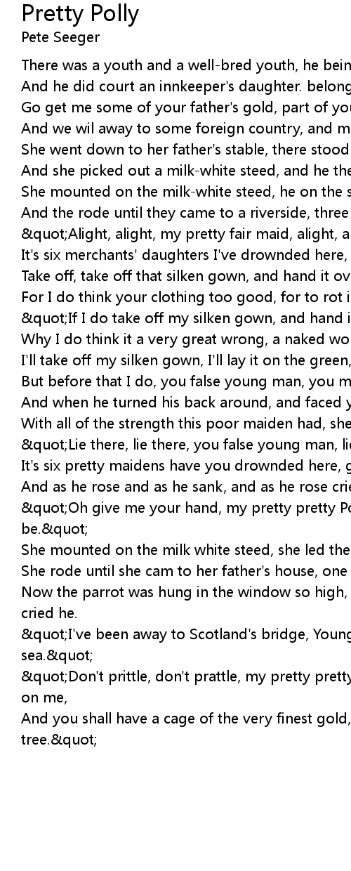 "Don't prittle, don't prattle, my pretty pretty Polly, don't tell no tales on me, |