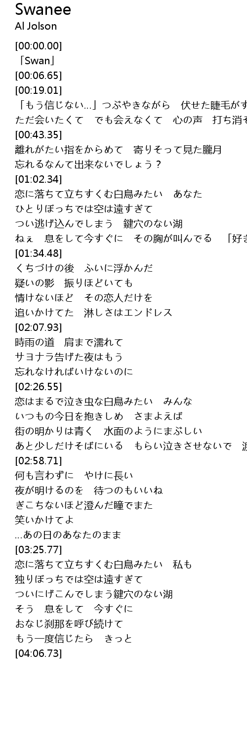 | [03:26.81] | 恋に落ちて立ちすくむ白鳥みたい 私も |