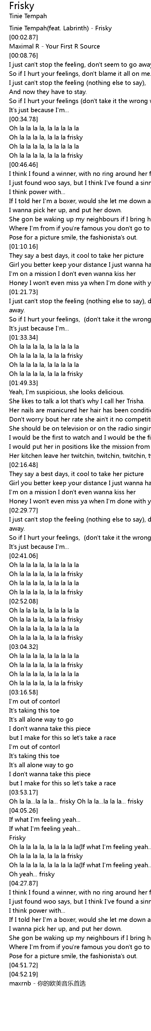 | [00:00.44] | Tinie Tempah(feat. Labrinth) - Frisky |