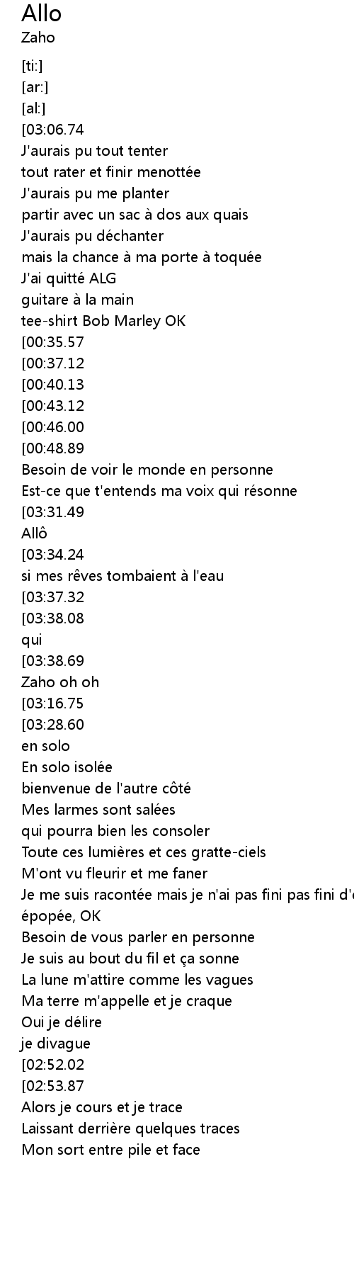 | [03:50.42][03:38.69][03:26.65][03:14.96][02:39.87][02:28.49][01:18.27][01:06.54] | C'est Zaho oh oh |