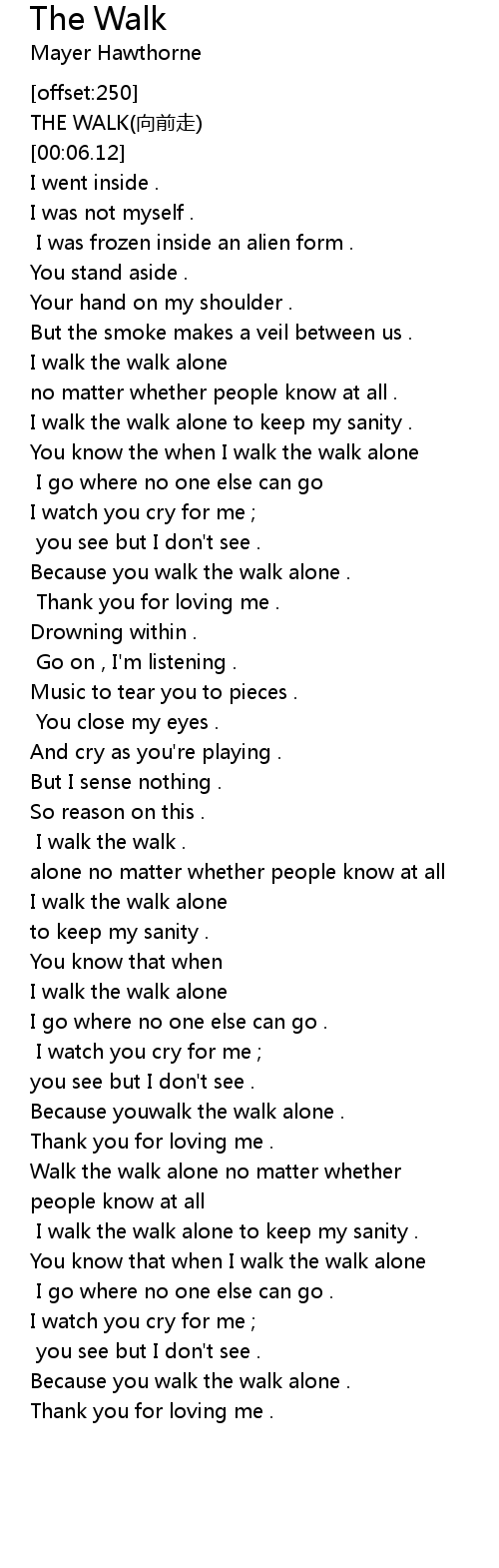 | [02:31.38] | Because youwalk the walk alone . |
