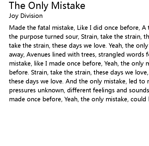 Made the fatal mistake, Like I did once before, A tendency just to take, Till the purpose turned sour, Strain, take the strain, these days we love, Strain, take the strain, these days we love. Yeah, the only mistake was that you ran away, Avenues lined with trees, strangled words for the day, Yeah, the only mistake, like I made once before, Yeah, the only mistake, could have made it before. Strain, take the strain, these days we love, Strain, take the strain, these days we love. And the only mistake, led to rumours unfound, Led to pressures unknown, different feelings and sounds, Yeah, the only mistake, like I made once before, Yeah, the only mistake, could have made it before. |
